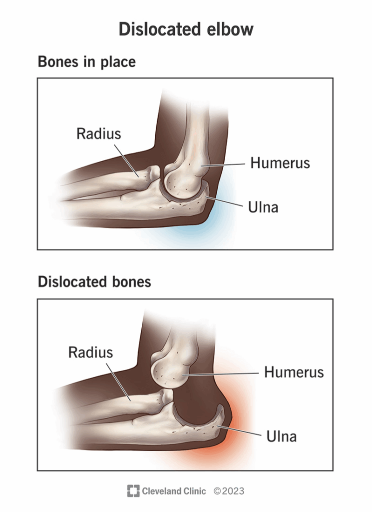 Elbow dislocations can range from simple dislocations (no bone fracture) to complex dislocations (accompanied by fractures of the radius, ulna, or humerus).